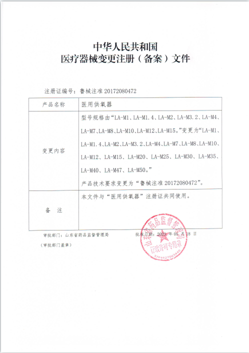 2023年5月18日已取得山東省藥品監督管理局行政許可“醫療器械變更注冊(備案)文件”,醫用供氧器型號規格由“LA-M1、LA-M1.4、LA-M2、LA-M3.2LA-M4LA-M7、LA-M8、LA-M10、LA-M12、LA-M15。”變更為“LA-M1LA-M1.4、LA-M2、LA-M3.2、LA-M4、LA-M7、LA-M8、LA-M10LA-M12、LA-M15、LA-M20、LA-M25、LA-M30、LA-M35LA-M40、LA-M47、LA-M50。”